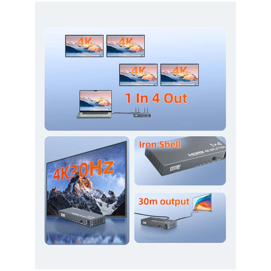 • 1 Input 4 Output HDMI Splitter: Duplicates one HDMI signal to four displays simultaneously without signal loss.