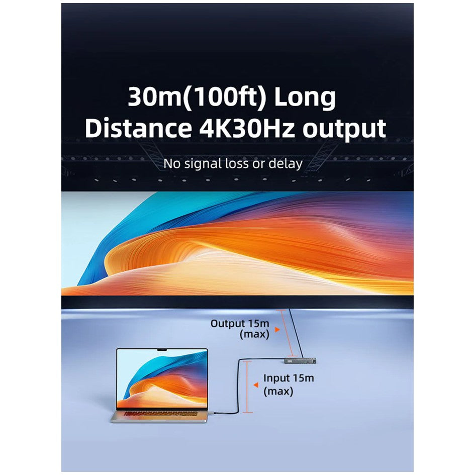 • Long-Distance Transmission: Supports up to 30 meters (100 feet) total cable length (15m input + 15m output).
